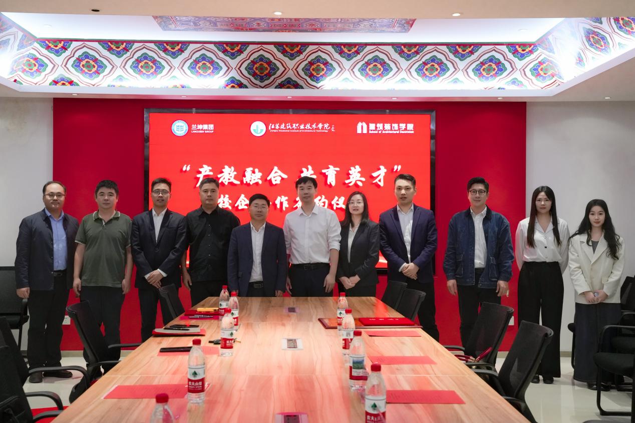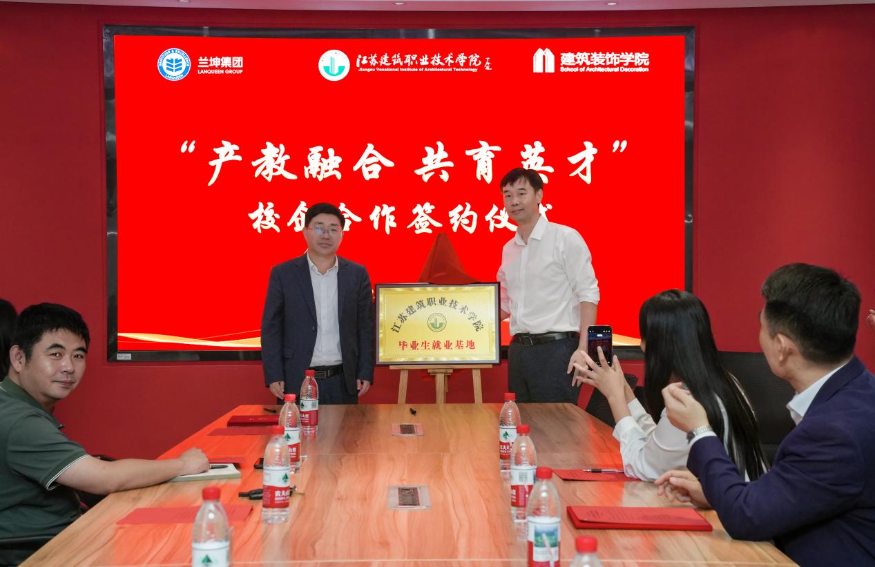 9月29日下午,江苏建筑职业技术学院建筑装饰学院与江苏兰坤控股集团有限公司合作签约暨“毕业生就业基地揭牌”仪式在学院会议室隆重举行。江苏建筑职业技术学院党委副书记、校长沈士德、科技开发与对外合作处处长王俭、学生工作处处长娄志刚、招生与就业处副处长周磊、建筑装饰学院党总支书记王正扬、院长王峰、党总支副书记石峰;深度合作企业江苏兰坤控股集团有限公司董事长魏锋、人资总监苏坡、人资主管史梦姣、人资专员杨敏出席会议。会议由学院党总支副书记石峰主持。本次活动以“产教融合,共育英才”为主题,旨在通过校企深度合作,搭建人才共育平台,推动教育链、人才链与产业链有机衔接,为建筑行业高质量发展注入新动能。