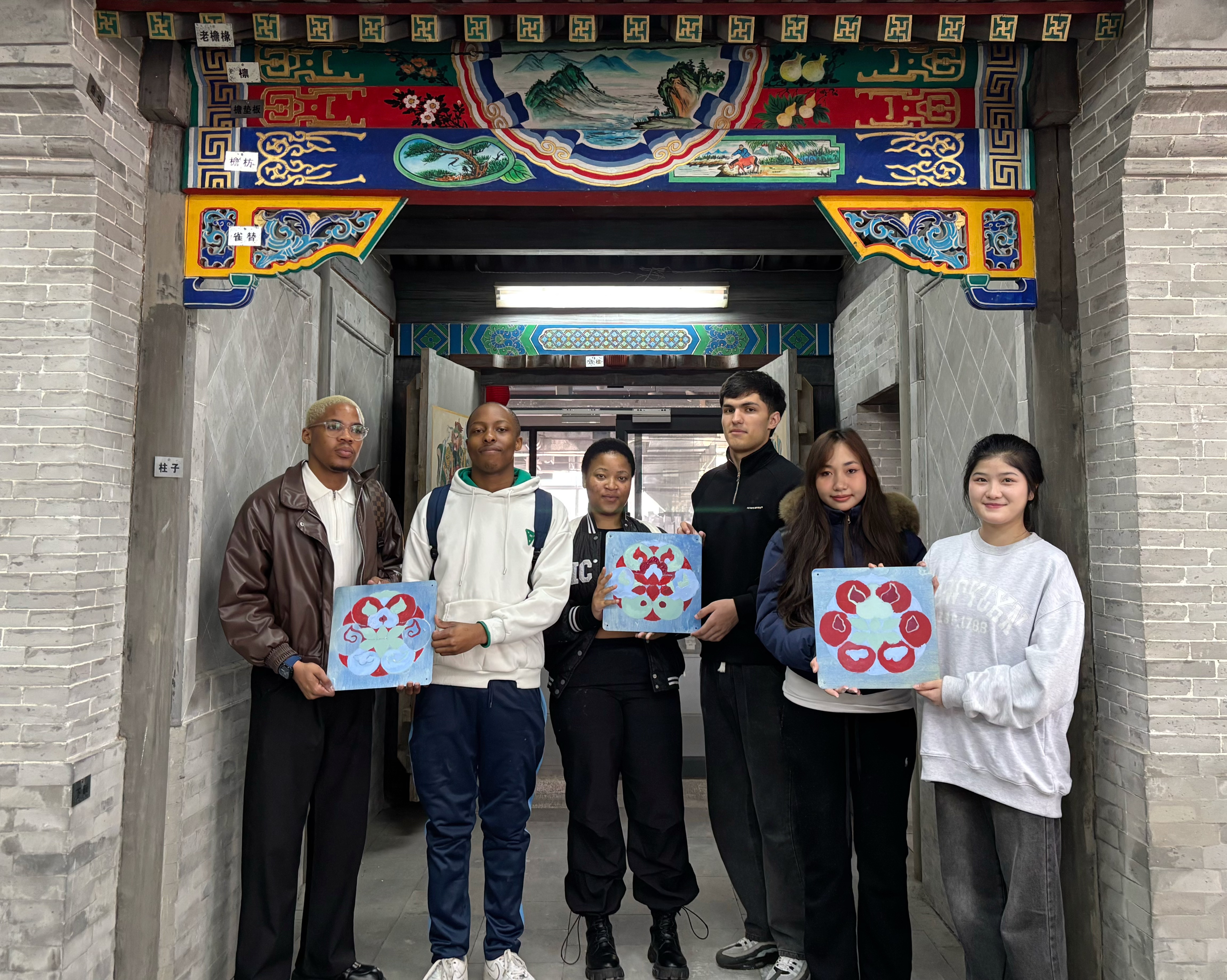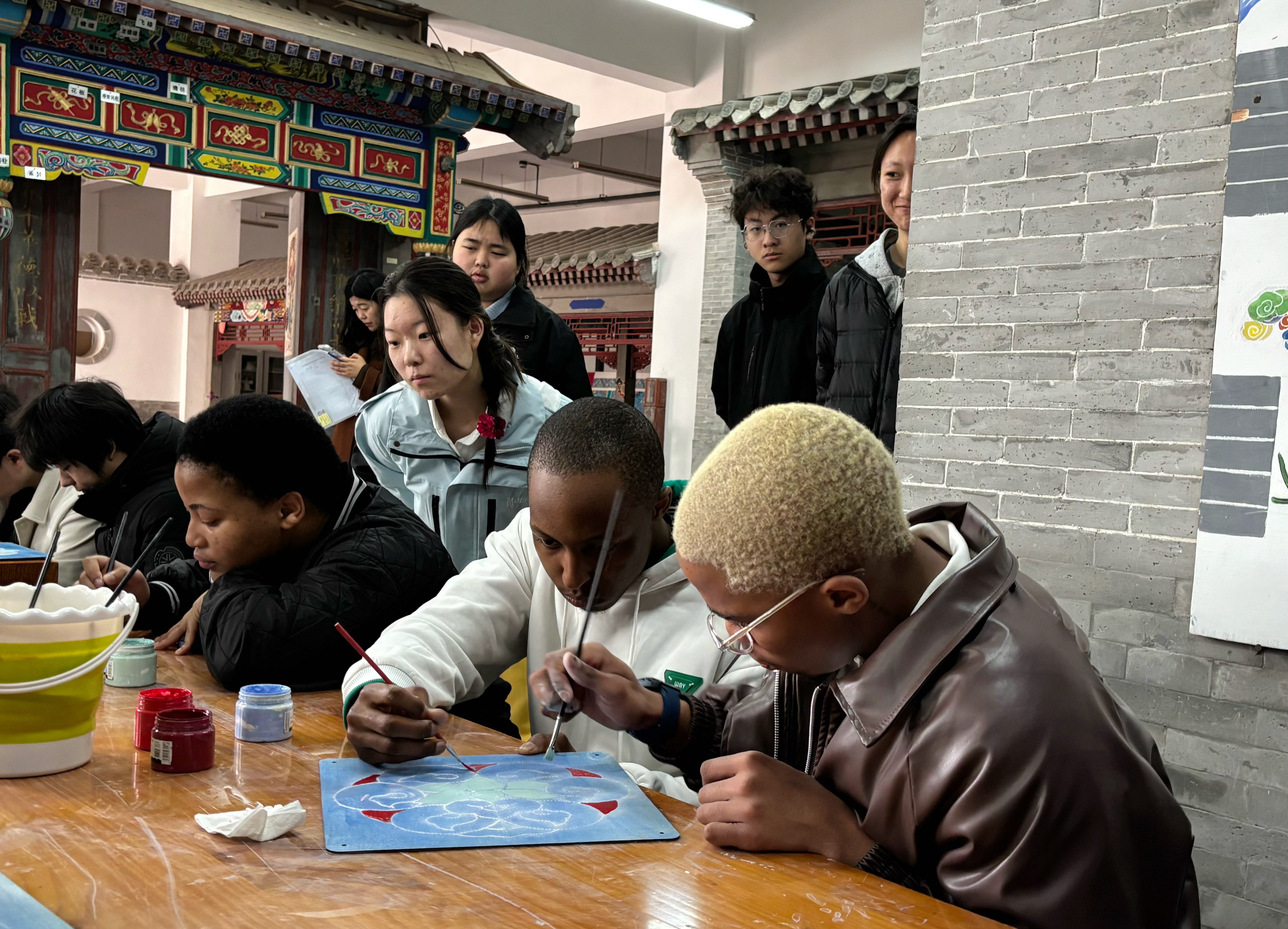 在互动交流环节,留学生们近距离观察古建筑木构件、砖瓦石雕、彩绘纹样的精美细节,亲手触摸古建构件感受传统工艺的精湛,亲身体验彩画技艺的精巧。针对留学生们提出的关于建筑结构、文化寓意、建造工艺等问题,随行教师逐一耐心解答,用通俗易懂的语言搭建起文化沟通的桥梁,让大家在直观体验中读懂中国古建筑的独特美学与文化价值。