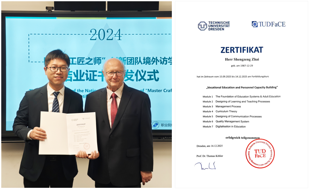 为深入汲取德国职业教育先进经验,推动国家“工匠之师”队伍建设与职业教育改革实践深度融合,团队成员翟胜增于2025915日至1213日赴德国参加教育部组织的2024年国家“工匠之师”创新团队境外访学研修。本次访学团组共有34名教师参加,分别来自34个国家级教师创新团队,访学活动主要在德累斯顿工业大学开展。