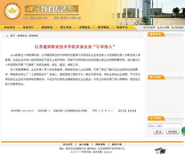 2014级新生入学教育阶段,江苏建筑职业技术学院先后邀请十多家知名企业老总或人力资源部负责人为新生做入学教育。这些企业负责人做完报告后不是马上离开学校,而都不约而同地为在该校建立的企业学院招聘学员。他们面向三个年级同时开展“订单班”的招生宣传、报名、面试、组班工作。